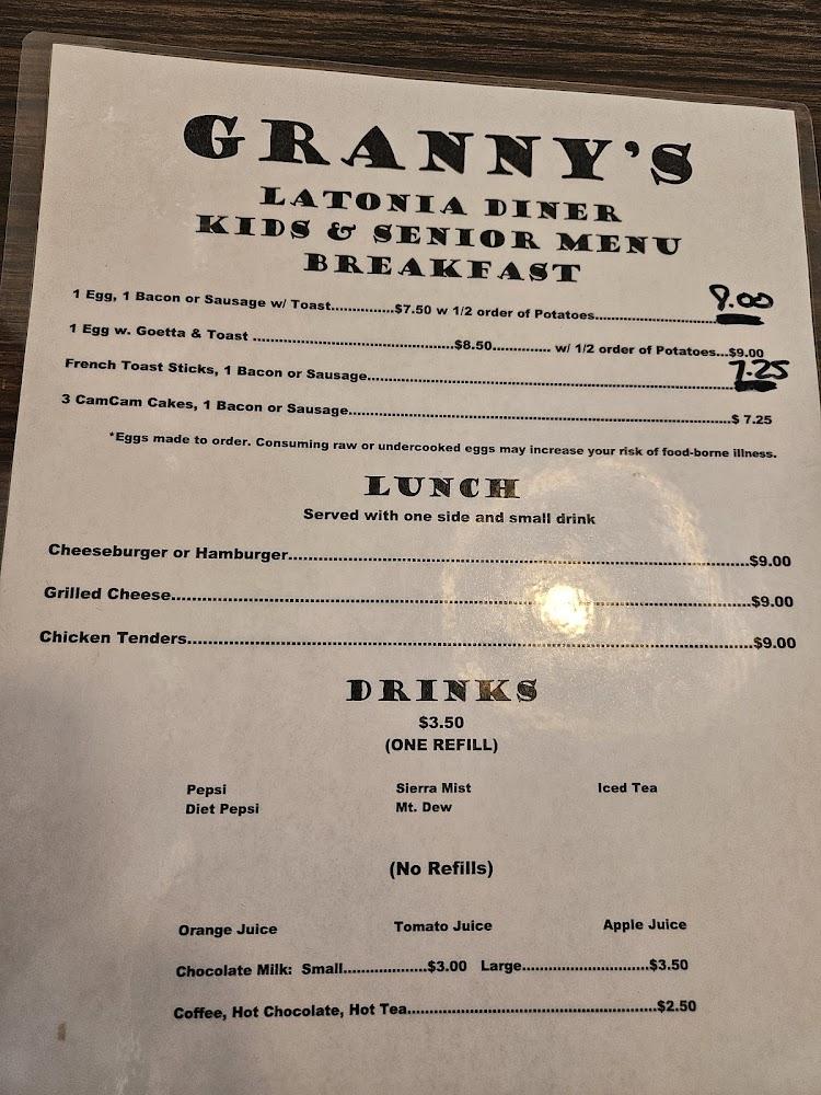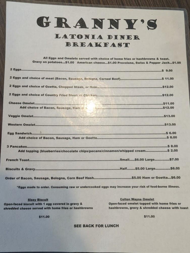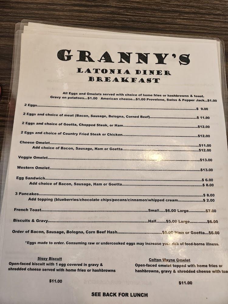 Granny's Latonia Diner boasts a menu that celebrates comfort food. Breakfast remains the focus, featuring options like eggs any style, homemade pancakes, and goetta dishes. Lunch features burgers and grilled sandwiches such as the turkey club and cheeseburger, appealing to various tastes.